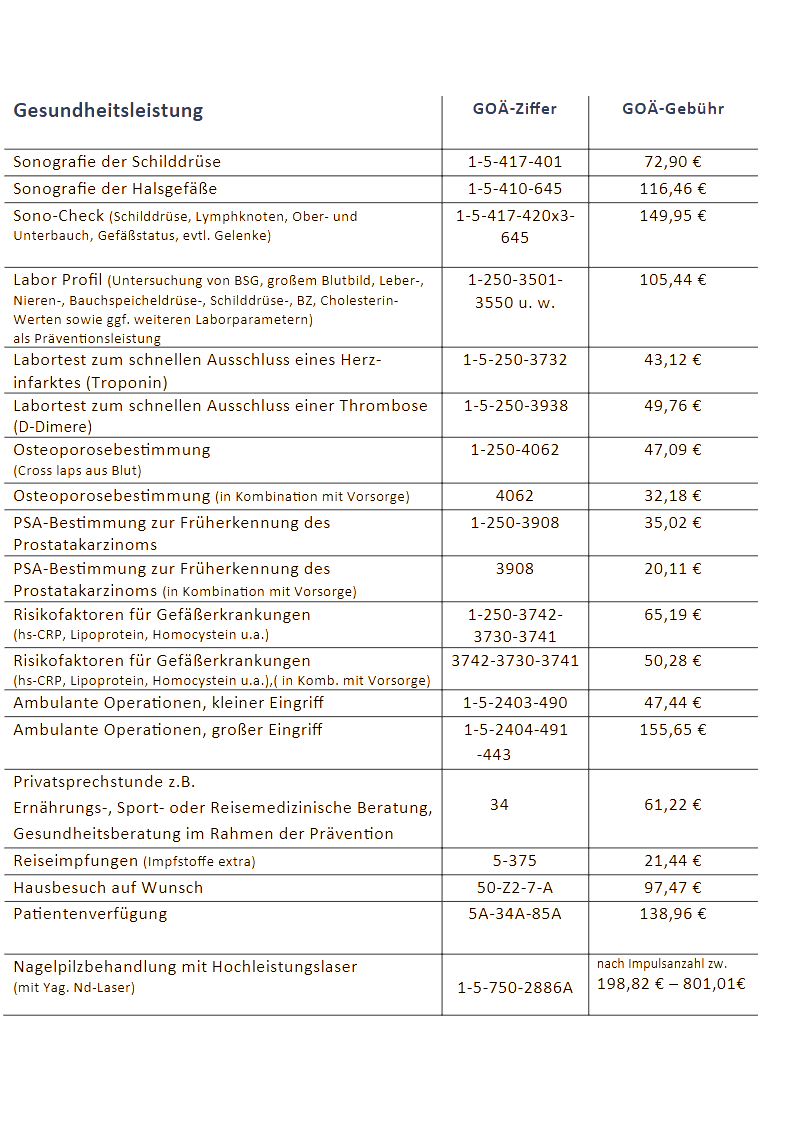 Zur Information haben wir die sonst üblichen Gebühren nach der GOÄ (Gebührenordnung für Ärzte) mit aufgeführt. Für Fragen und Anregungen stehen wir Ihnen gerne zur Verfügung. Für den bezahlten Betrag erhalten Sie eine Quittung. Rechnungsstellung erfolgt auf Wunsch entsprechend den Ziffern und Gebühren nach der GOÄ (Gebührenordnung für Ärzte).